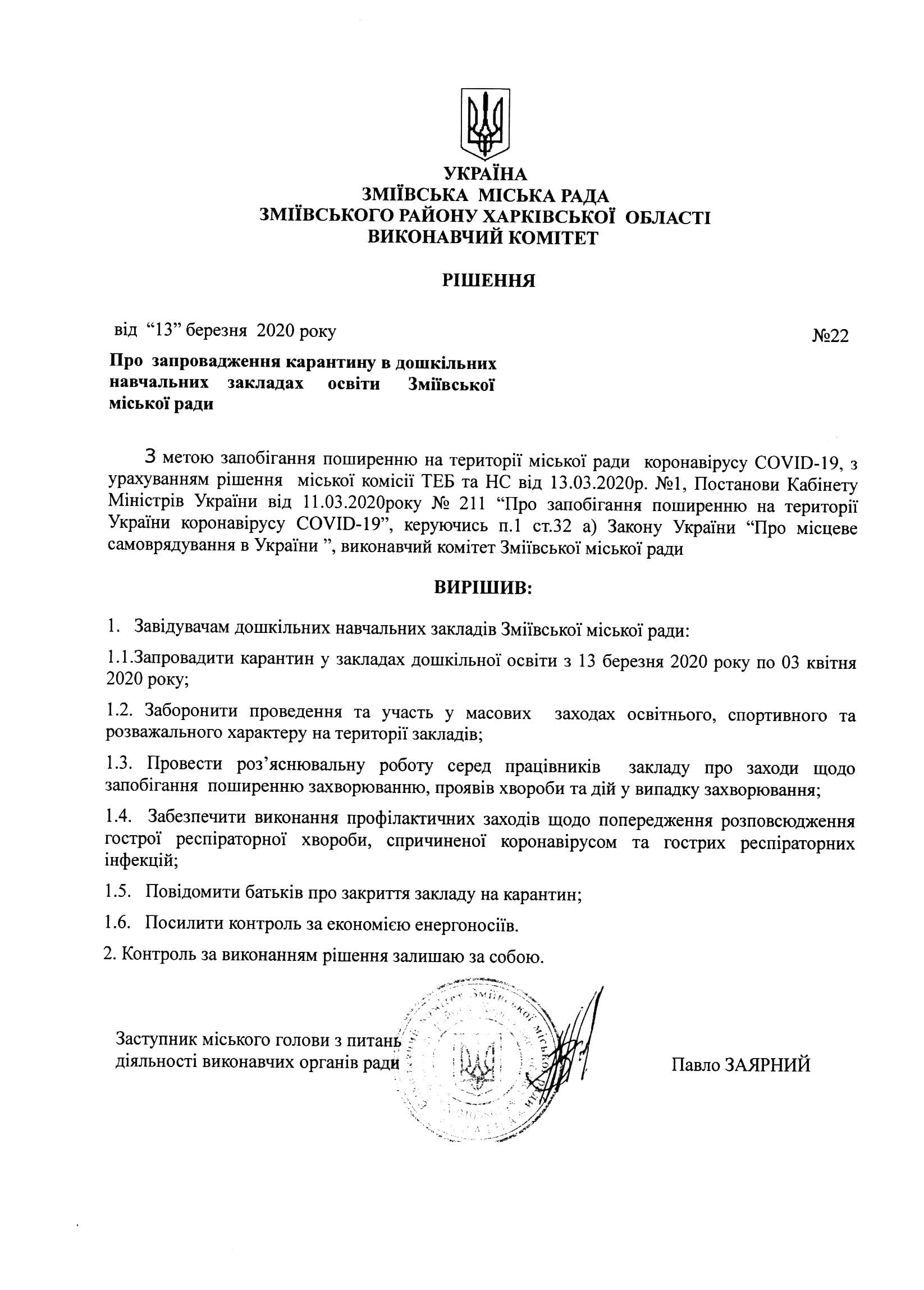 Рішення виконавчого комітету Зміївської міської ради від 13 березня 2020 року №22 Про запровадження карантину в дошкільних навчальних закладах освіти Зміївської міської ради Завантажити 16 березня 2020 16 березня 2020